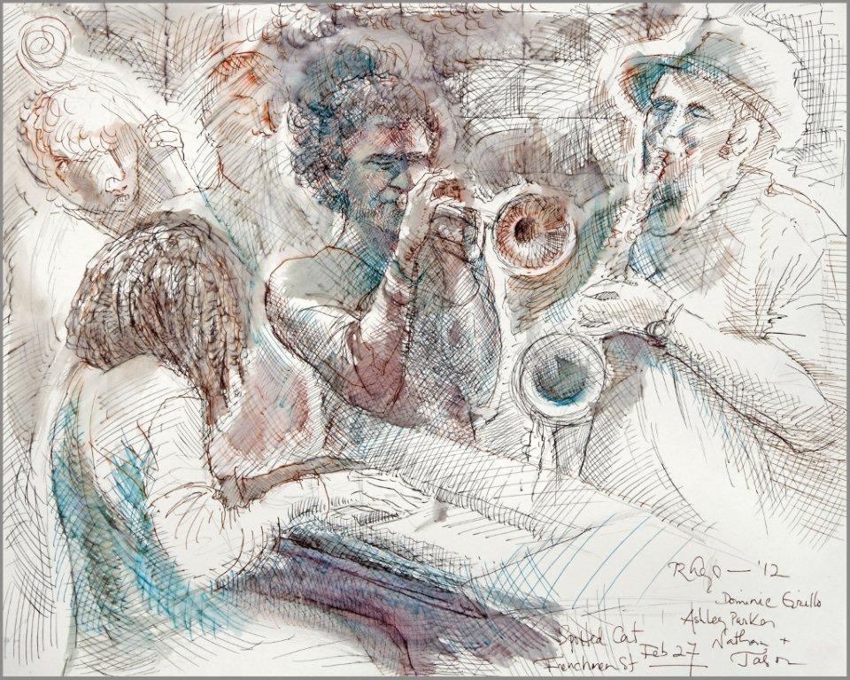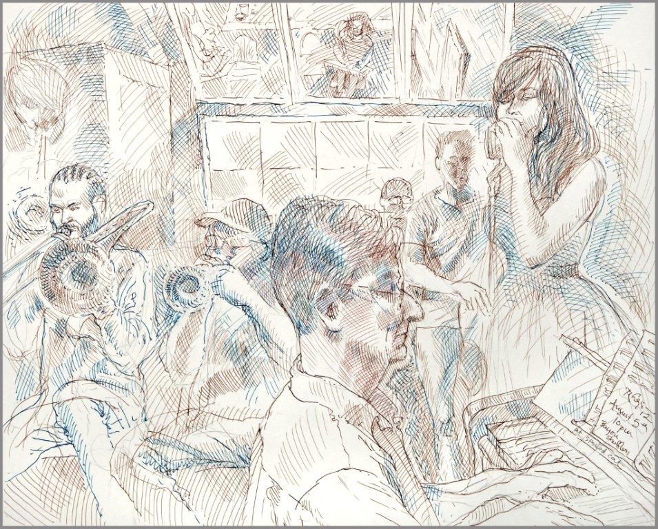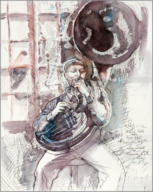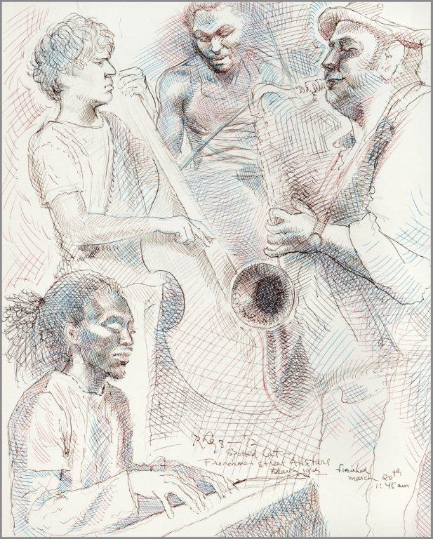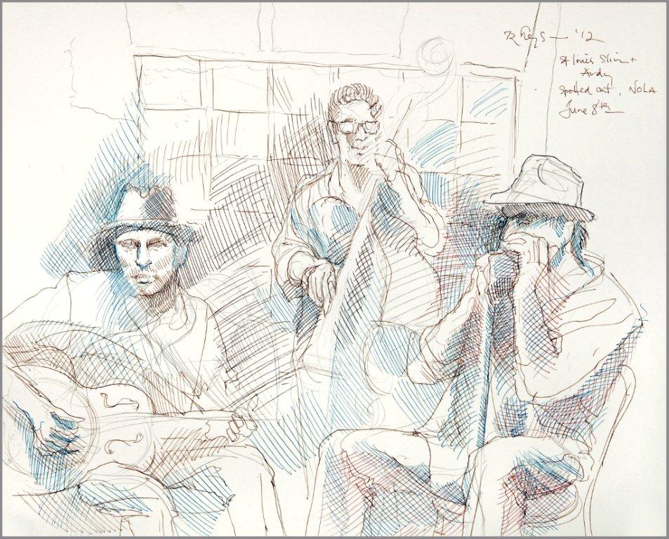 Emilie, a third-generation painter, is the daughter of Noel Rockmore (sometimes referred to as the Picasso of New Orleans). Rockmore is well known, for painting more than 800 portraits of the musicians of Preservation Jazz Hall. Emilie has been painting for more than 30 years, and now regularly sketches the musicians working in New Orleans today. She was always a painter first, but in the past two years, drawing has taken precedence and, happily, a sketchpad is well suited to the environment of music clubs.