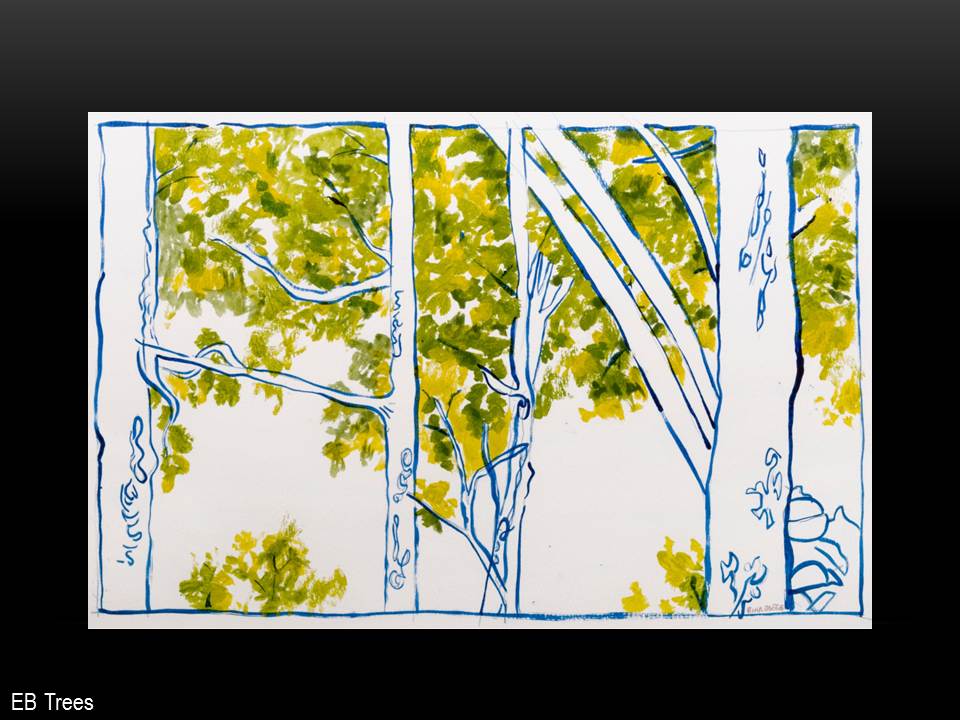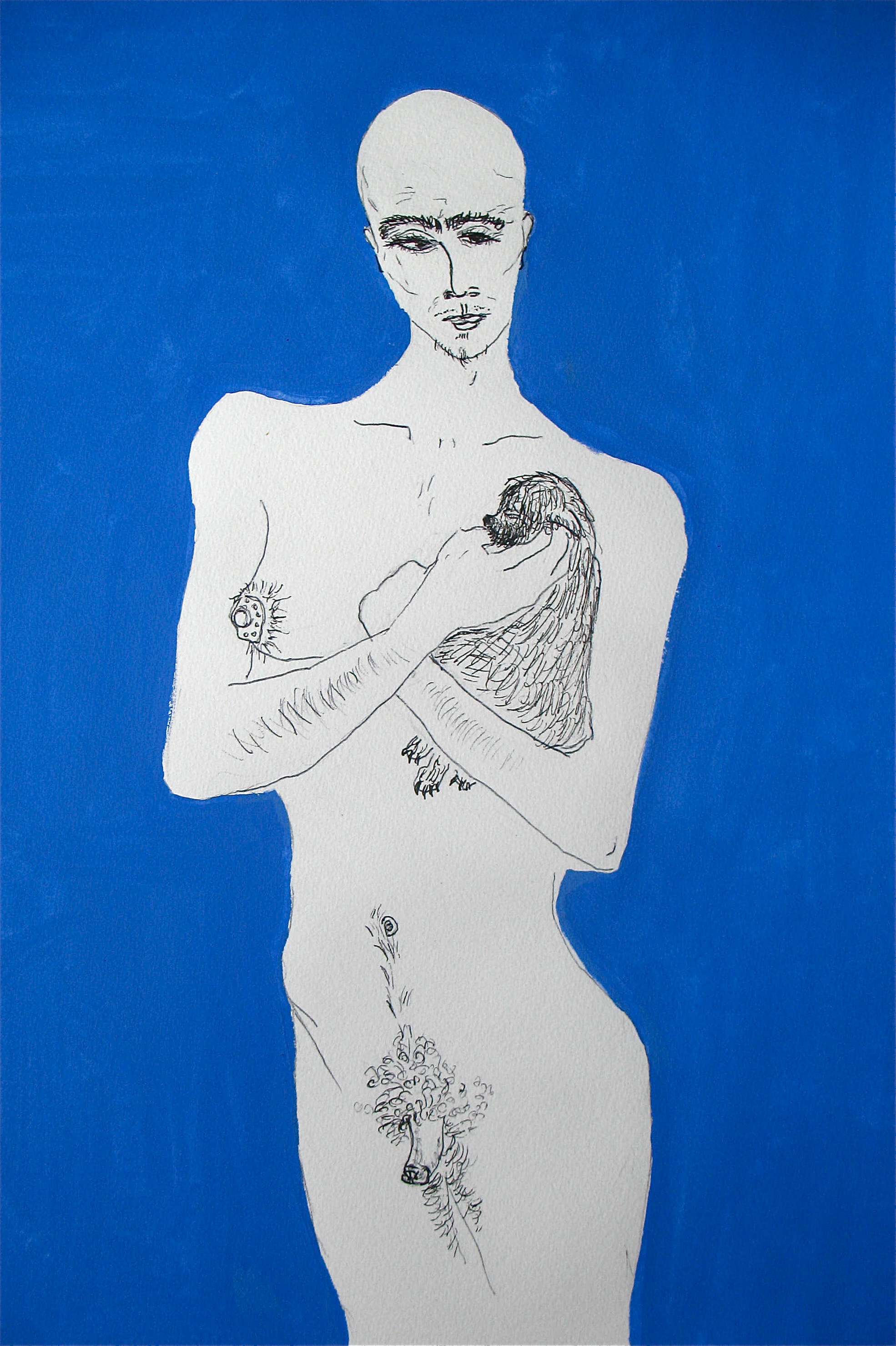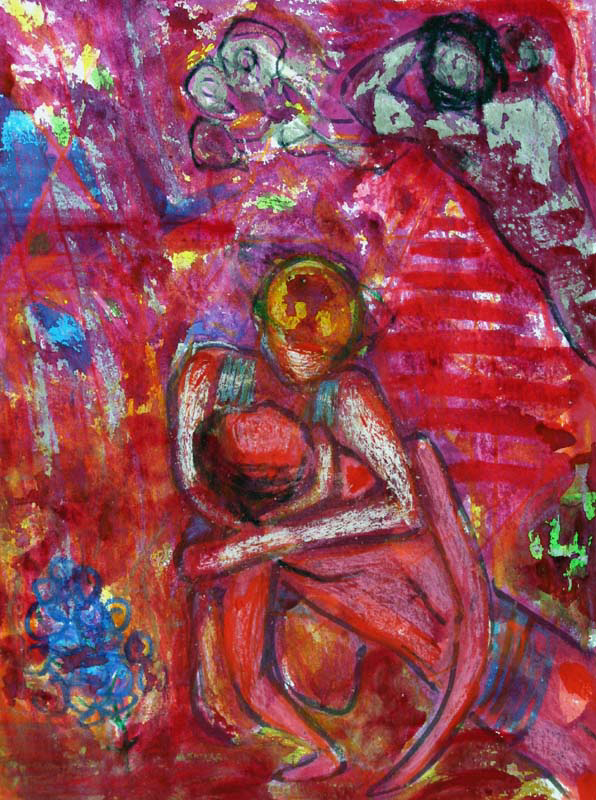 I often begin a piece by drawing “blind” with white crayon on white paper, then let the application of paint reveal content and guide me as I work up the rest of the picture.